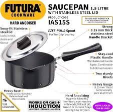 Hard Anodised Aluminium - tough and durable, will not pit, tarnish or corrode and will stay looking new for years. It has specially designed technologically advanced EZEE POUR spout for almost no-drip pouring. It has a strong, stay-cool plastic handle fixed on sturdy stainless steel bracket which is permanently riveted to the Pan. It comes with stainless steel lid. It is made of hard anodised aluminium, it is built heavily to last longer. Suitable for use on domestic gas, induction, electric, ceramic and halogen stoves. Perfect for making tea, coffee, soups, sauces, chutneys, gravies, curries, Rice, Pilau, Dal; Boiling noodles, pasta, eggs; Cooking food for infants; Reheating food and for tadka. The Hard Anodised Saucepan has technologically advanced EZEE-POUR� which is a specially designed spout for easy pouring with almost no drip, and which is particularly preferred for making soups, tea or other beverages, or boiling milk. The Saucepans have strong, stay-cool plastic handles fixed on sturdy stainless steel brackets which are permanently riveted to the pans. The Hard Anodised finish on these pots will stay looking new for years. These pots are suitable for domestic gas, induction, electric, ceramic and halogen cooktops. The Lid is made of AISI 304, 18/8 food grade Stainless Steel that is extremely hygienic, durable and non-reactive to most foods. It has a comfortable, stay-cool plastic knob.