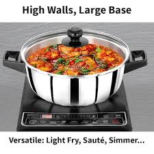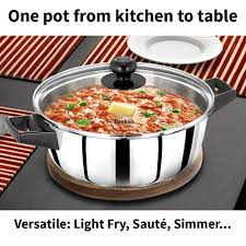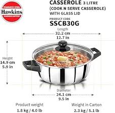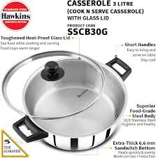 High walls, large base - versatile: light-fry, saut, simmer.... Two handles - easy to Cook and Serve. Food-Grade Stainless Steel with Sandwich Bottom. Toughened Heat-Proof Glass Lid, shows food while cooking and serving. Works on Gas Induction. One pot from kitchen to table. The Stainless Steel Cook n Serve Casseroles are distinguished by comfortable plastic handles which are permanently riveted to the pans. The handles are carefully designed to provide greater comfort and safety. The body is made of AISI 304, 18/8 superior food grade stainless steel for healthy and hygienic cooking. The 6.6 mm extra-thick sandwich bottom stays flat, heats evenly and will not develop hotspots. The AISI 430 grade magnetic stainless steel base plate that makes the pan work well on both Gas and Induction. Hawkins Stainless Steel Cookware also comes with a toughened Glass Lid made of 4 mm thick, heat-resistant glass with a strong stainless steel rim and stay-cool knob.