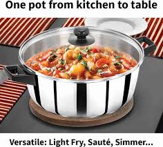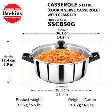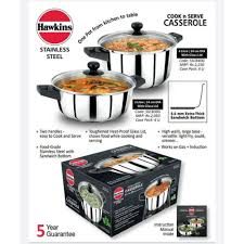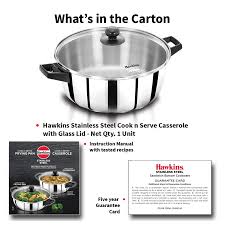 The Stainless Steel Cook n Serve Casseroles are distinguished by comfortable plastic handles which are permanently riveted to the pans. The handles are carefully designed to provide greater comfort and safety. The body is made of AISI 304, 18/8 superior food grade stainless steel for healthy and hygienic cooking. The 6.6 mm extra-thick sandwich bottom stays flat, heats evenly and will not develop hotspots. The AISI 430 grade magnetic stainless steel base plate that makes the pan work well on both Gas and Induction. Hawkins Stainless Steel Cookware also comes with a toughened Glass Lid made of 4 mm thick, heat-resistant glass with a strong stainless steel rim and stay-cool knob.