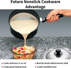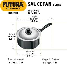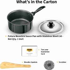 PFOA Free Non-stick coating locked into tough Hard Anodized Aluminium - lasts longer. It has flared rims for easy pouring. It comes with a stainless steel lid. It has a strong, stay-cool plastic handle which is permanently riveted to the Pan. It comes with stainless steel lid. High quality nonstick coating (made in Germany) is locked firmly into the tough Hard Anodized surface underneath - Futura Nonstick, properly used, will last longer than ordinary nonstick. Suitable for use on domestic gas, electric, ceramic and halogen stoves. Perfect for making tea, coffee, soups, sauces, chutneys, gravies, curries, Rice, Pilau, Dal; Boiling noodles, pasta, eggs; Cooking food for infants; Reheating food and for tadka. The Nonstick Saucepan has flared rims, specially designed for easy pouring, and which is particularly preferred for making soups, tea or other beverages, or boiling milk. The Saucepans have strong, stay-cool plastic handles fixed on sturdy stainless steel brackets which are permanently riveted to the pans. The cooking surface is made of PFOA-free with a unique patented process by which high quality nonstick coating (made in Germany) is locked firmly into the tough Hard Anodized surface underneath. Therefore, the nonstick, if used properly, would last longer than the ordinary nonstick. These pots are suitable for domestic gas, electric, ceramic and halogen cooktops. The Lid is made of AISI 304, 18/8 food grade Stainless Steel that is extremely hygienic, durable and non-reactive to most foods. It has a comfortable, stay-cool plastic knob.