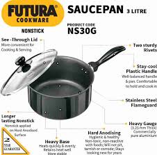 PFOA Free Non-stick coating locked into tough Hard Anodized Aluminium - lasts longer. It has flared rims for easy pouring. It comes with a glass lid. It has a strong, stay-cool plastic handle which is permanently riveted to the Pan. It comes with glass lid. High quality nonstick coating (made in Germany) is locked firmly into the tough Hard Anodized surface underneath - Futura Nonstick, properly used, will last longer than ordinary nonstick. Suitable for use on domestic gas, electric, ceramic and halogen stoves. Perfect for making tea, coffee, soups, sauces, chutneys, gravies, curries, Rice, Pilau, Dal; Boiling noodles, pasta, eggs; Cooking food for infants; Reheating food and for tadka. The Nonstick Saucepan has flared rims, specially designed for easy pouring, and which is particularly preferred for making soups, tea or other beverages, or boiling milk. The Saucepans have strong, stay-cool plastic handles fixed on sturdy stainless steel brackets which are permanently riveted to the pans. The cooking surface is made of PFOA-free with a unique patented process by which high quality nonstick coating (made in Germany) is locked firmly into the tough Hard Anodized surface underneath. Therefore, the nonstick, if used properly, would last longer than the ordinary nonstick. These pots are suitable for domestic gas, electric, ceramic and halogen cooktops. The toughened, thick Glass Lid is made of heat-resistant glass with a strong stainless steel rim and stay-cool knob. It stops splatter of hot foods.