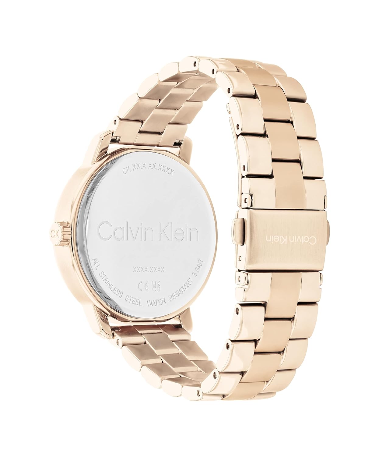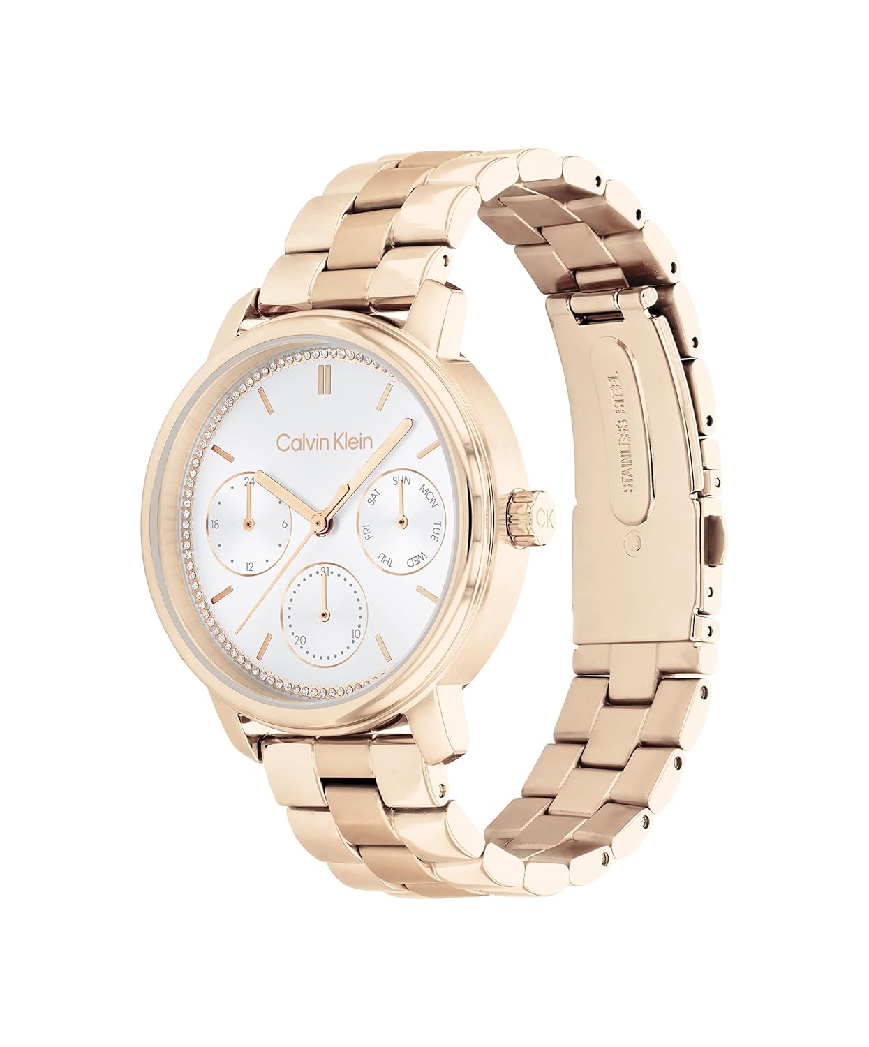 Calvin Klein Women's carnation gold IP watch. Featuring crystal detailing on a white sunray dial, triple sub-eye detailing and a carnation gold IP bracelet. Multi-function, 38MM dial.