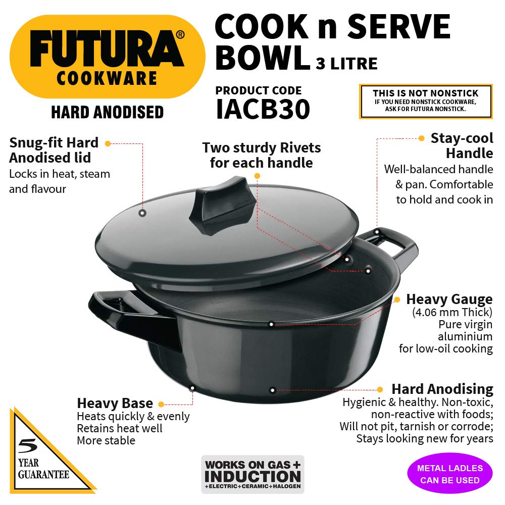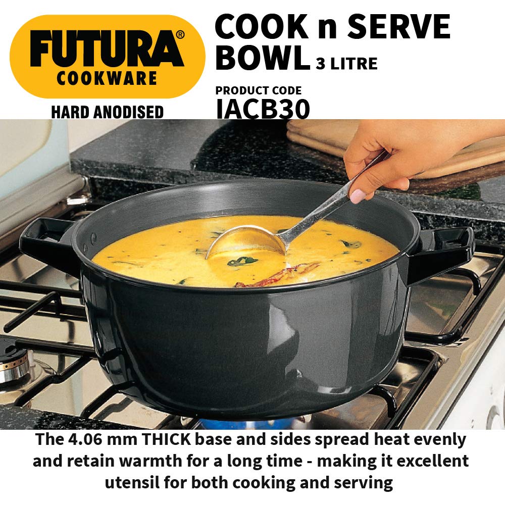 The 4.06 mm thick base and sides spread heat evenly and retain warmth for a long time – making it an excellent utensil for both cooking and serving. It is offered with Hard Anodised Lid