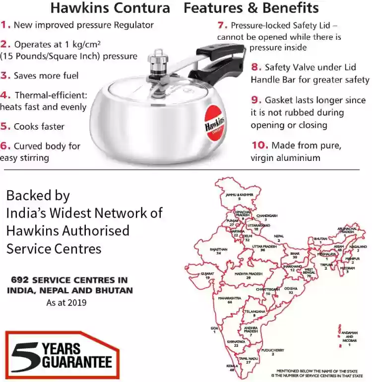You can prepare your favourite meals in a jiffy with the efficient Hawkins Contura Aluminium Pressure Cooker. It is designed with rounded sides that make stirring, removing, and viewing your food convenient. Built with an inside-fitting lid, this pressure cooker keeps the pressure locked for safety and efficiency while cooking. Moreover, a safety valve is situated below the lid's handlebar, which deflects the steam in a downward direction to prevent burns.