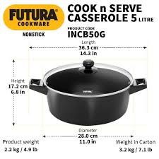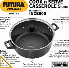 Futura Cook n Serve Casseroles are ideal for cooking a wide range of Indian and Western dishes such as pulao, biryani, vegetables, dals, soups, stews, curries and desserts. The 4.06 mm thick base and sides of these Cook n Serve Casseroles spread heat evenly and retain warmth for a long time – making them excellent utensils for both cooking and serving. Cooking and serving in the same Casserole makes good sense – the food stays hot longer and you have less to clean up and less for storage. These Casseroles are designed for convenient cooking and elegance on the dining table. The cooking surface is made of PFOA-free with a unique patented process by which high quality nonstick coating (made in Germany) is locked firmly into the tough Hard Anodised surface underneath. Therefore, the nonstick, if used properly, would last longer than the ordinary nonstick. It comes with a tough, heat-resistant Glass Lid with a strong stainless steel rim. It is suitable for domestic gas, induction, electric, ceramic and halogen cooktops.