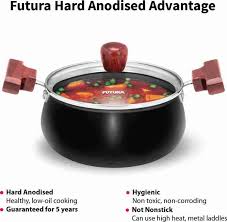 Unique Curved body - For easy stirring of difficult dishes. Stainless Steel Brackets - Firmly riveted. Will not loosen. Rosewood Handles and Knob - Stay-cool, natural, durable. Comfortable to hold. Protective Hard Anodising - Will not tarnish or corrode. Stays looking new for years. Heavy Gauge Body (3.25 mm Extra-Thick) - Cooks fast & evenly. Food stays hot longer. Toughened Heat-Proof Glass Lid - Easy to see food while cooking and when eating at the table. Futura Cook n Serve Handi is a modern version of the traditional Indian cooking utensil used for favourful, less water cooking. The unique curved body makes it easy to stir dishes which are otherwise difficult to stir in the utensils with vertical walls. It is ideal for cooking a wide range of dishes such as pulao, biryani, vegetables, dals, soups, stews, curries and desserts. The 3.25 mm thick base and sides of thee Cook n Serve Handi spread heat evenly and retain warmth for a long time ? making them excellent utensils for both cooking and serving. Cooking and serving in the same utensil makes good sense ? the food stays hot longer and you have less to clean up and less for storage. The Handi is designed for convenient cooking and elegance on the dining table. The Hard Anodised finish on the Handi will stay looking new for years. The Handi is offered with elegantly designed Glass Lid lid. It is suitable for domestic gas, electric, ceramic and halogen cooktops.