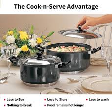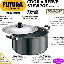 Hard Anodised Aluminium - tough and durable, will not pit, tarnish or corrode and will stay looking new for years. It is a modern version of the traditional Indian patila or degchi (a deep cooking vessel). The elegant stewpot can be used for cooking as well as serving on the table. It has 2 short, strong, comfortable and stay-cool plastic handles which are permanently riveted to the Pan. It has a strong and sturdy stainless steel lid to stop splatter of hot foods. Suitable for use on domestic gas, kerosene, electric, ceramic and halogen stoves. Perfect for Mutton Biryani (Rice Layered with Spicy Mutton), Sooji Halwa (Semolina Pudding), Bengal Fish Curry, Saut�ed Vegetables, Vegetable Pilau, Kadai Paneer (Stir-Fried Cottage Cheese), Egg Curry and Sukhi Dal (Dry Split Skinned Green Gram). The Futura Cook n Serve Stewpot is a modern version of the traditional Indian patila or degchi (a deep cooking vessel). In these Stewpots you can conveniently cook rice, dal, curries and many popular desserts such as Firni, Sooji Halwa and Ras Malai. The thick base and sides of these Stewpots spread heat evenly and retain warmth for a long time ? making them excellent utensils for both cooking and serving. Cooking and serving in the same pot makes good sense ? the food stays hot longer and you have less to clean up and less for storage. The Hard Anodised finish on these pots will stay looking new for years. The Stewpots have two stay-cool plastic handles. These pots are suitable for domestic gas, electric, ceramic and halogen cooktops. The Lid is made of AISI 304, 18/8 food grade Stainless Steel that is extremely hygienic, durable and non-reactive to most foods. It has a comfortable, stay-cool plastic knob.